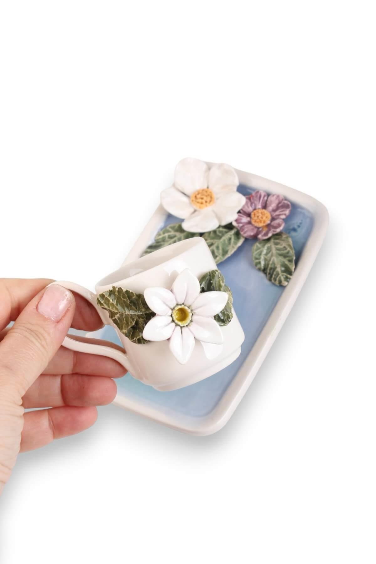 Her biri özenle elle şekillendirilmiş ve tek tek boyanmış olan bu özel tasarım papatya çiçekli kahve fincanı, masanıza baharın tazeliğini getiriyor.