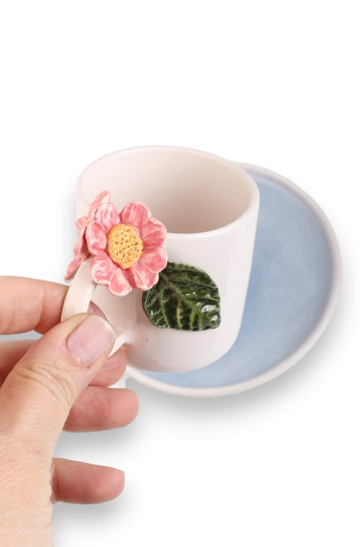 Her biri özenle elle şekillendirilmiş ve tek tek boyanmış olan bu özel tasarım papatya çiçekli kahve fincanı, masanıza baharın tazeliğini getiriyor.