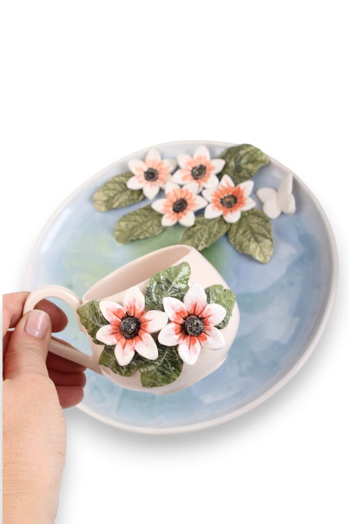 Her biri özenle elle şekillendirilmiş ve tek tek boyanmış olan bu özel tasarım papatya çiçekli kahve fincanı, masanıza baharın tazeliğini getiriyor.