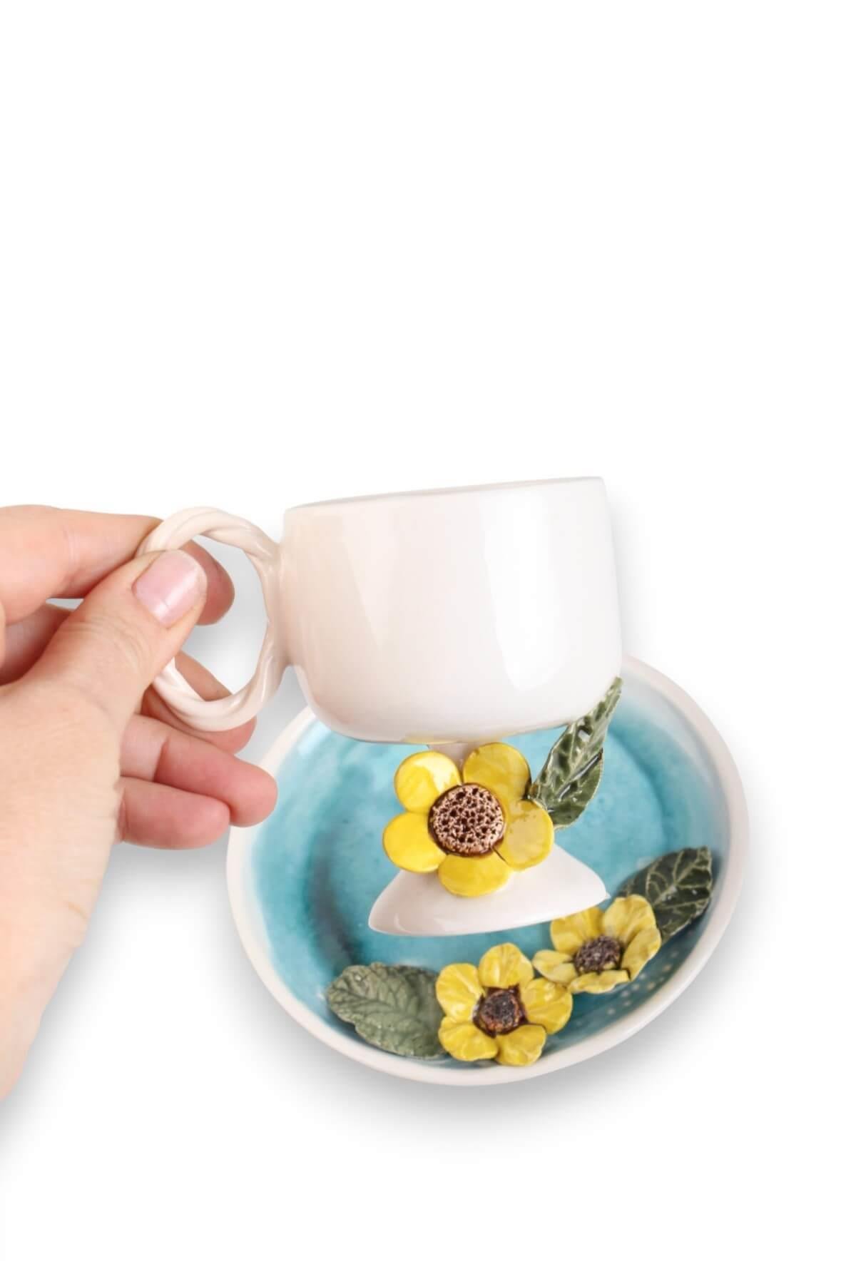 Seramik El Yapımı Sarı Papatyalı Çiçekli Kahve Fincanı No:1