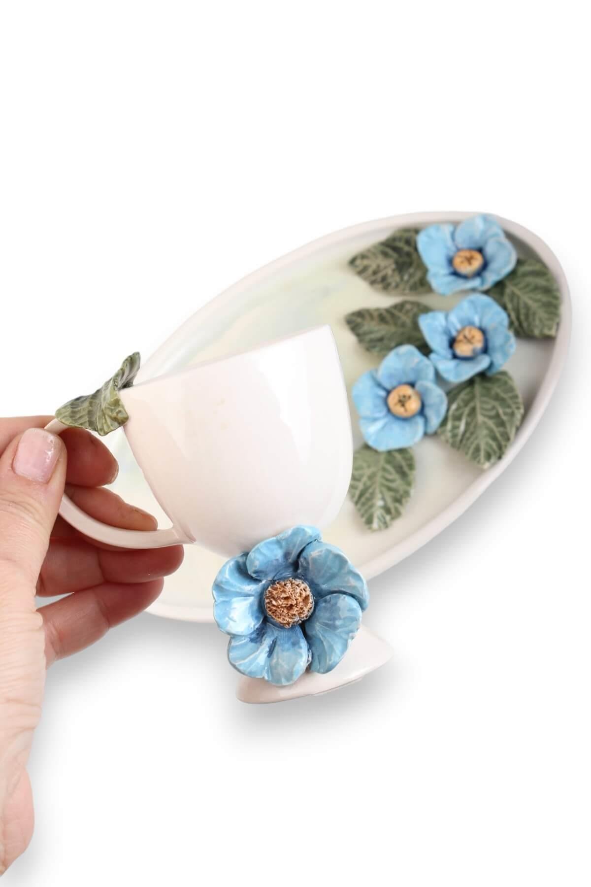 Her biri özenle elle şekillendirilmiş ve tek tek boyanmış olan bu özel tasarım mavi menekşeli kahve fincanı, masanıza huzur, incelik ve doğallık getiriyor.